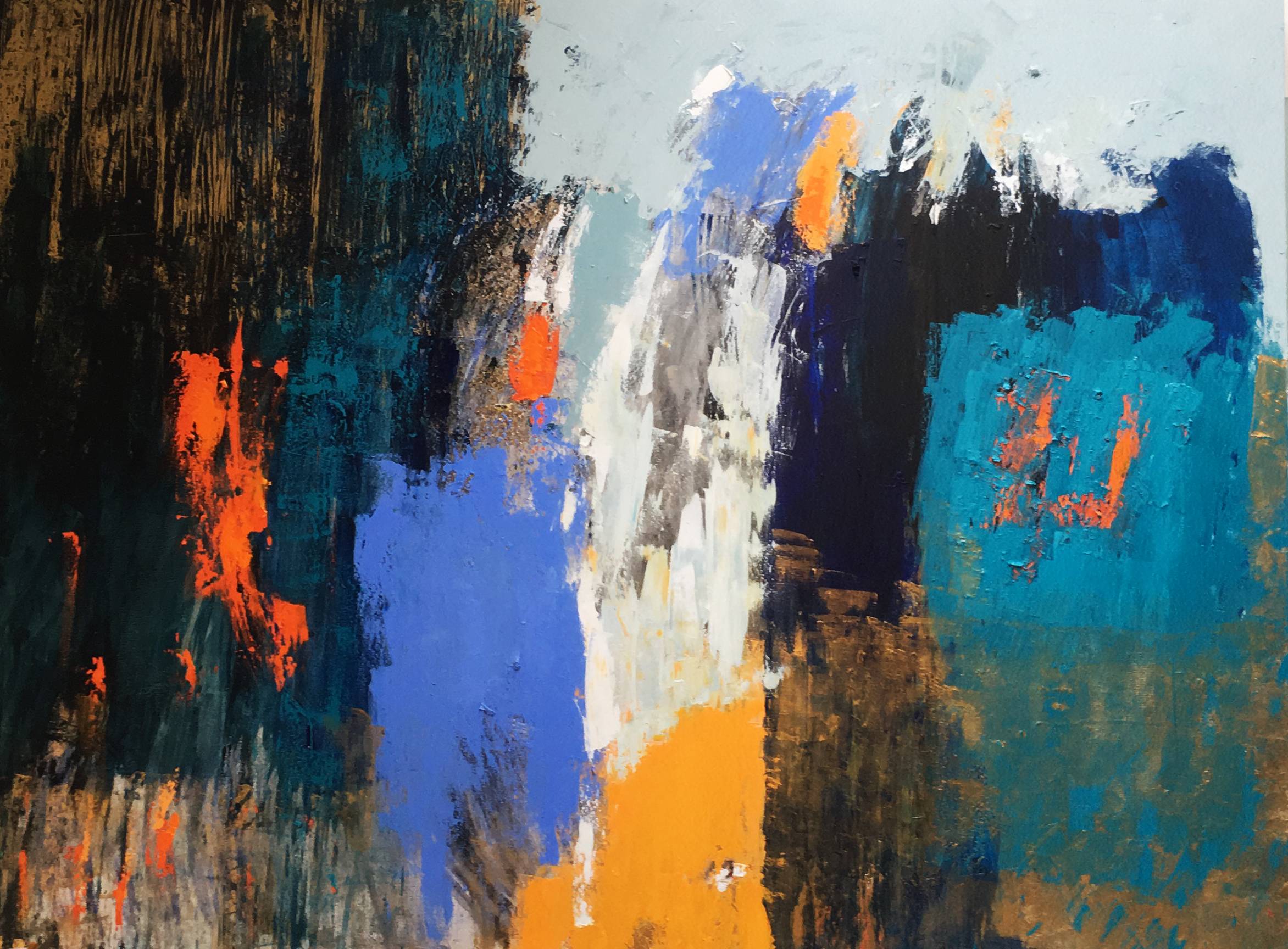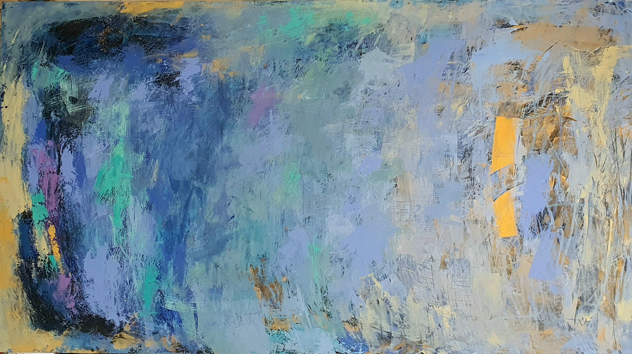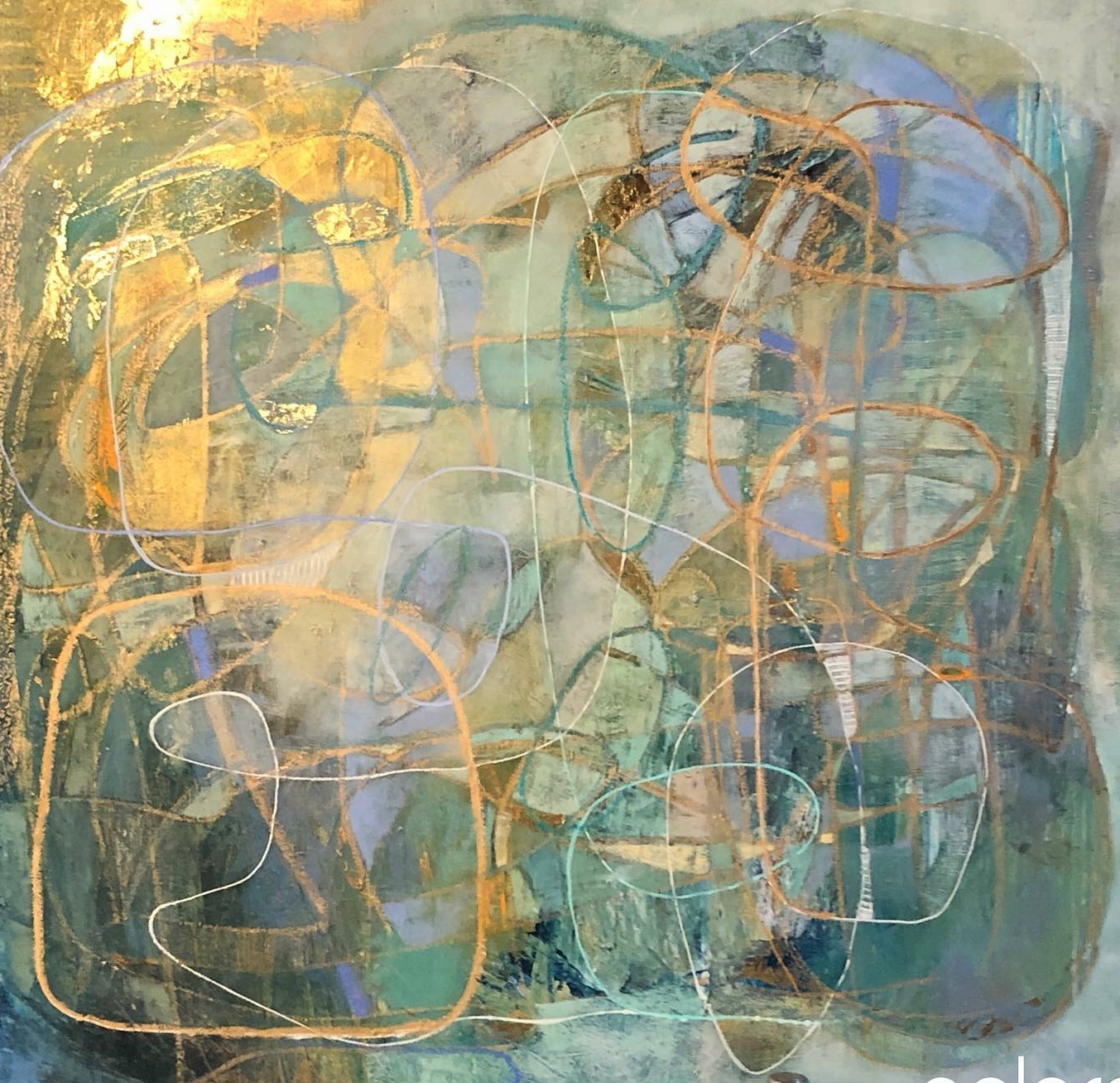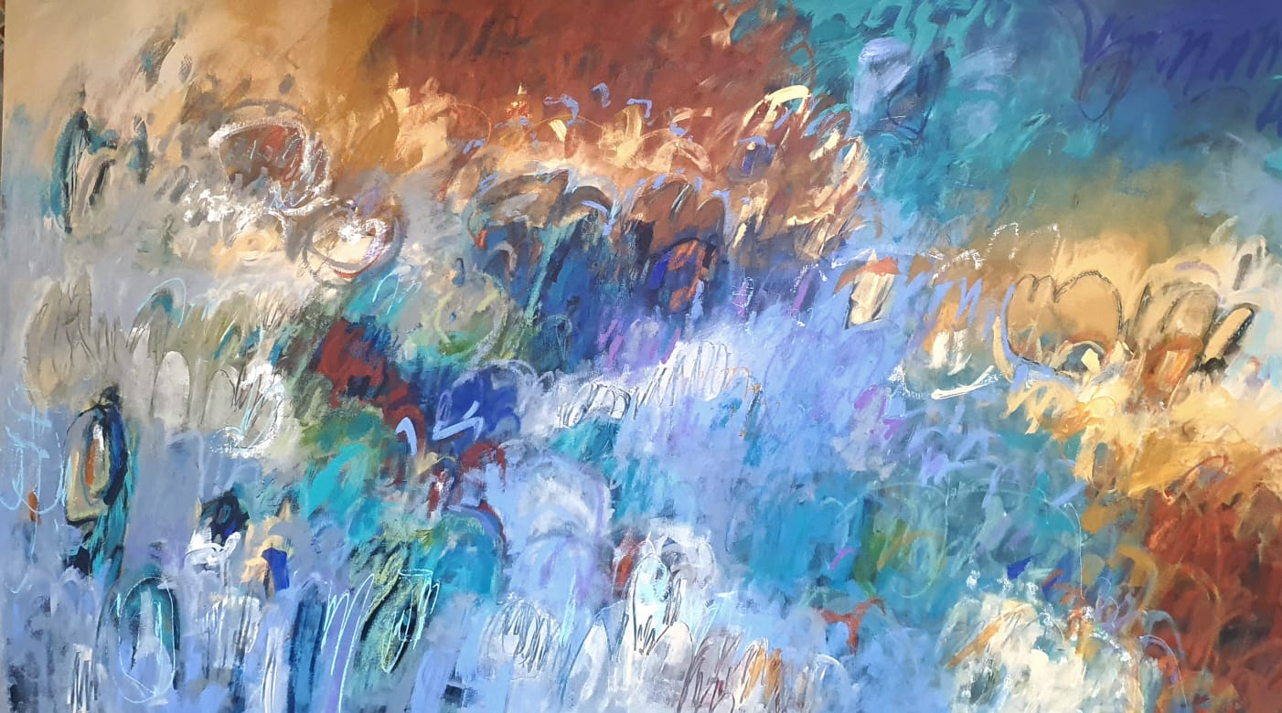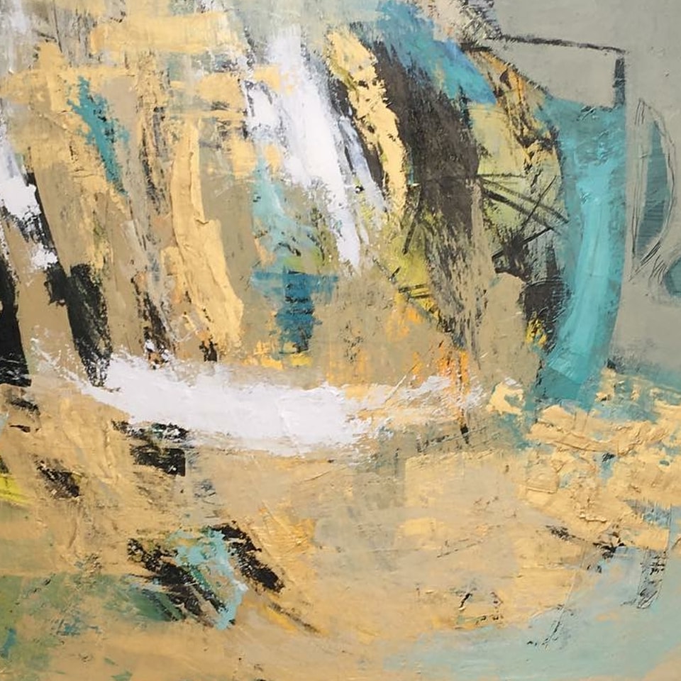 Poco a poco mi abstracto va cobrando sentido, los dorados emergen bajo los tonos turquesas y blancos, recordándome el mar del caribe, donde quisiera estar en este minuto. Cierro los ojos y pienso en esas aguas cristalinas color turquesa que me invitan al descanso y la meditación. Que mejor que mecerse en una hamaca mirando este espectacular color seducirte para entrar a él.