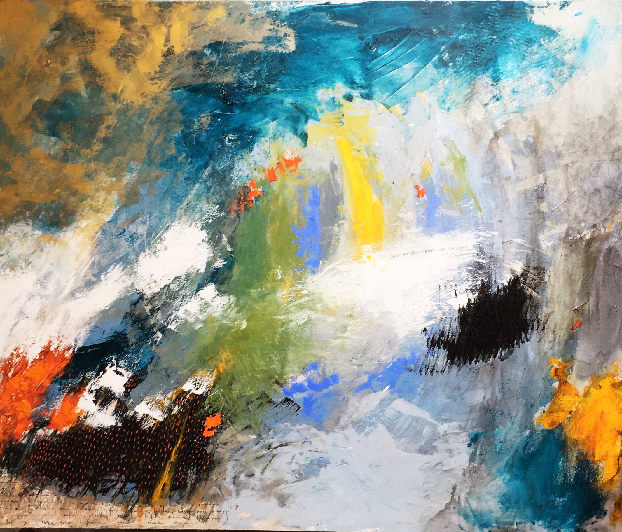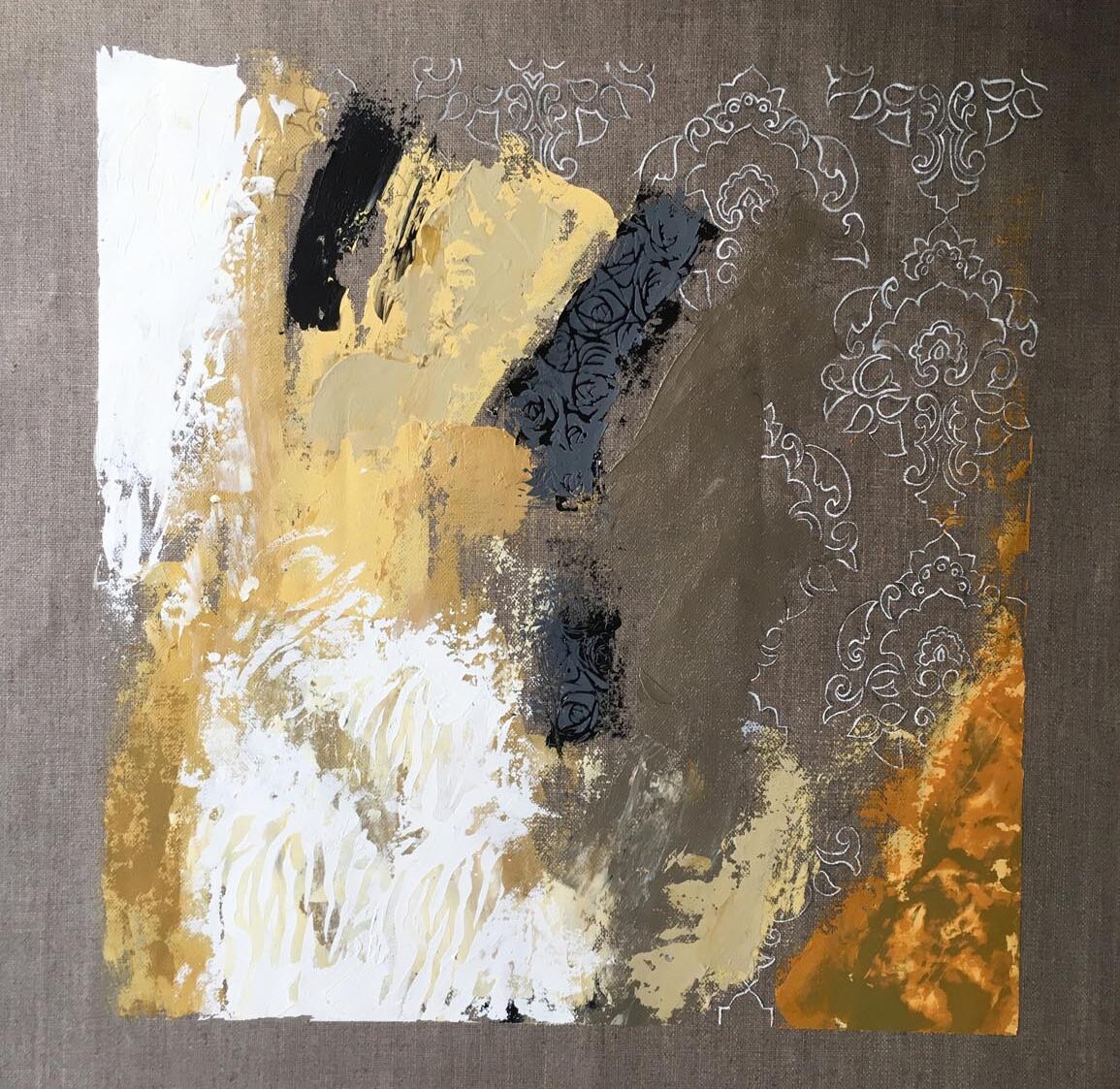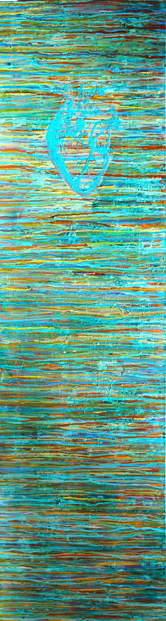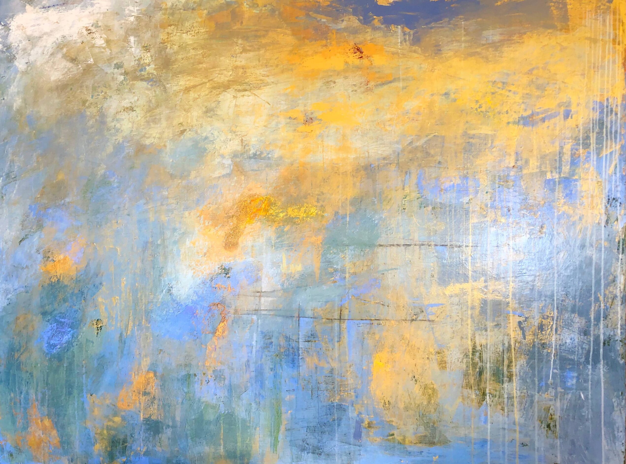 Poco a poco mi abstracto va cobrando sentido, los dorados emergen bajo los tonos turquesas y blancos, recordándome el mar del caribe, donde quisiera estar en este minuto. Cierro los ojos y pienso en esas aguas cristalinas color turquesa que me invitan al descanso y la meditación. Que mejor que mecerse en una hamaca mirando este espectacular color seducirte para entrar a él.