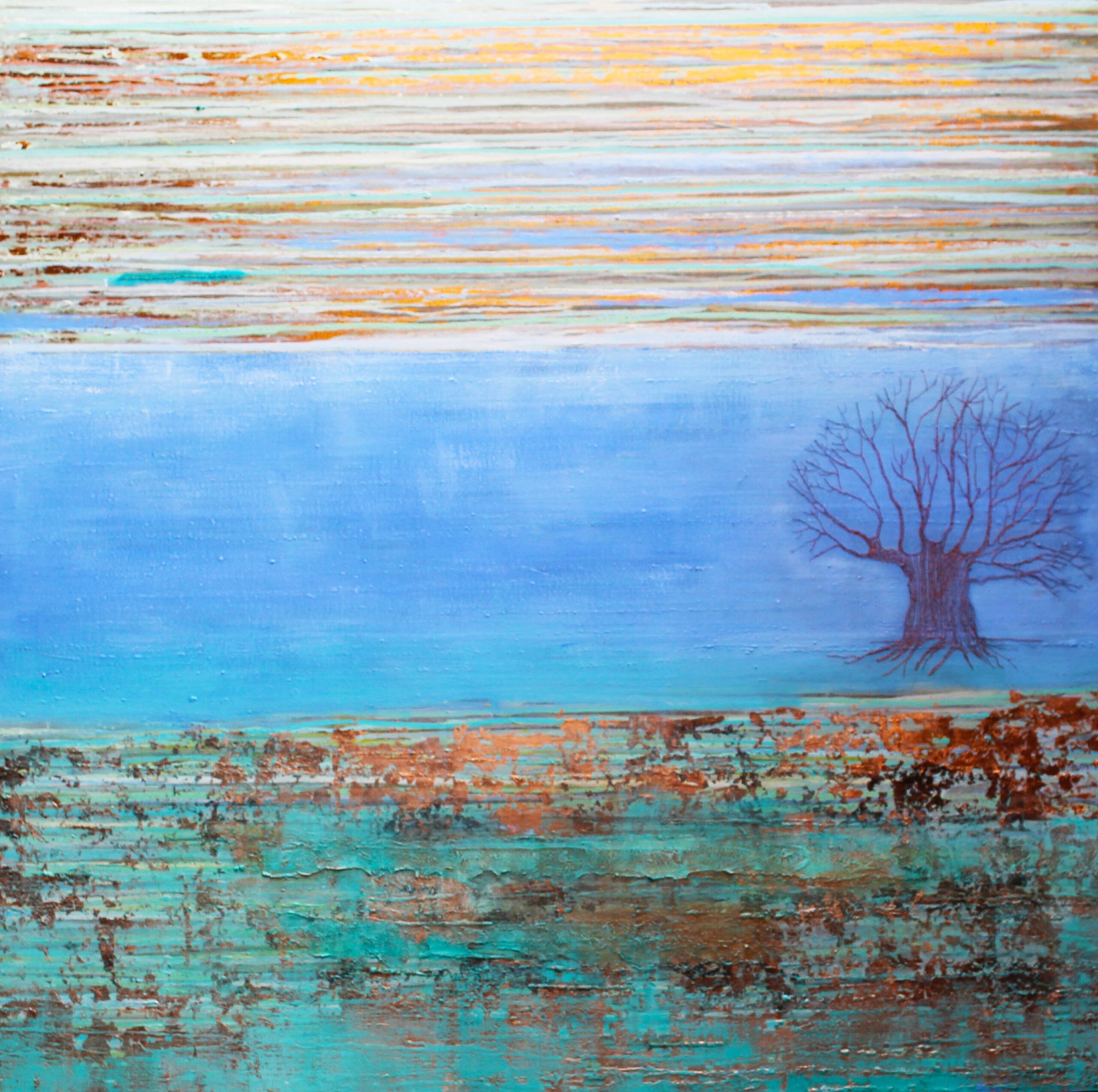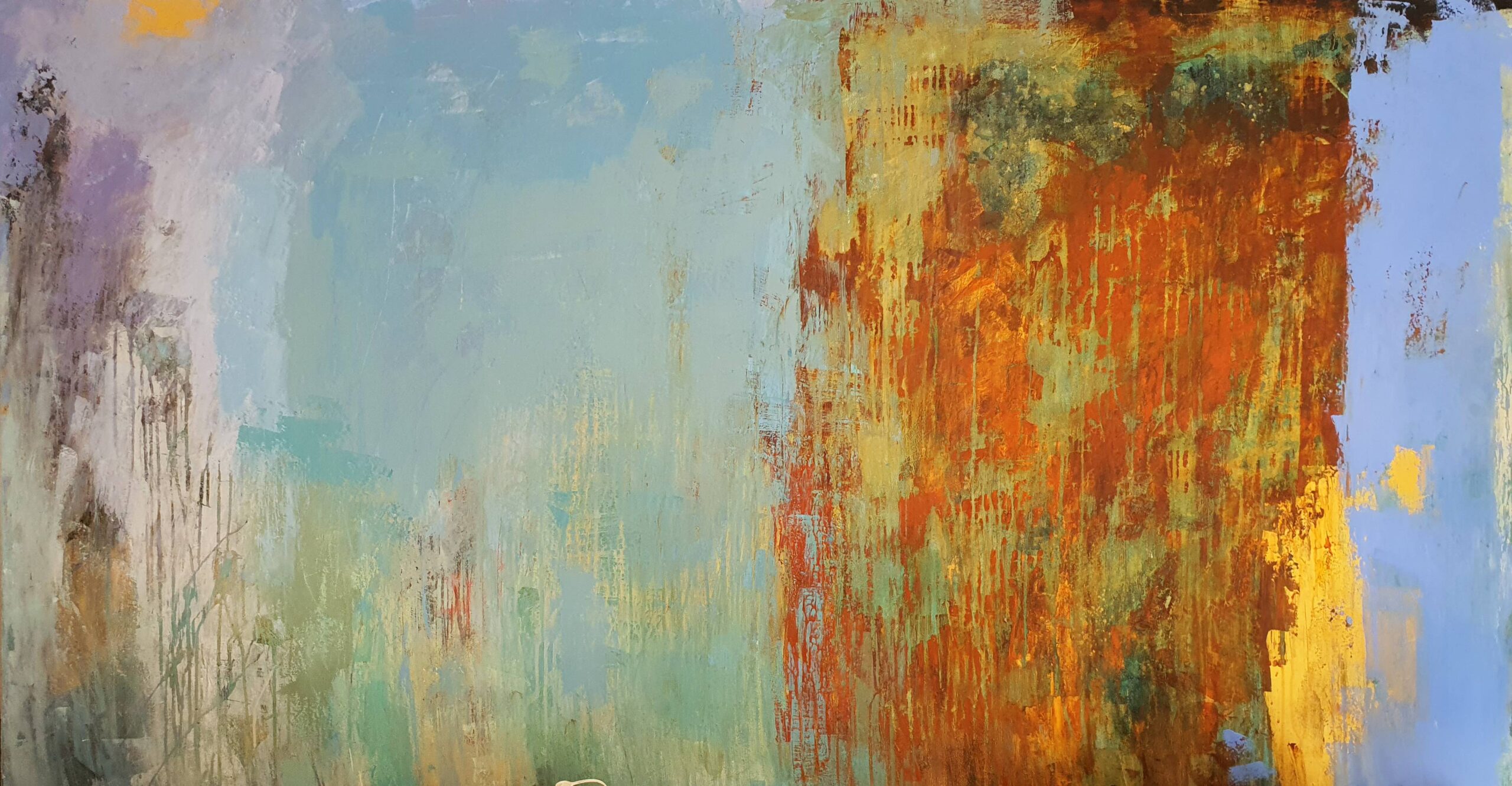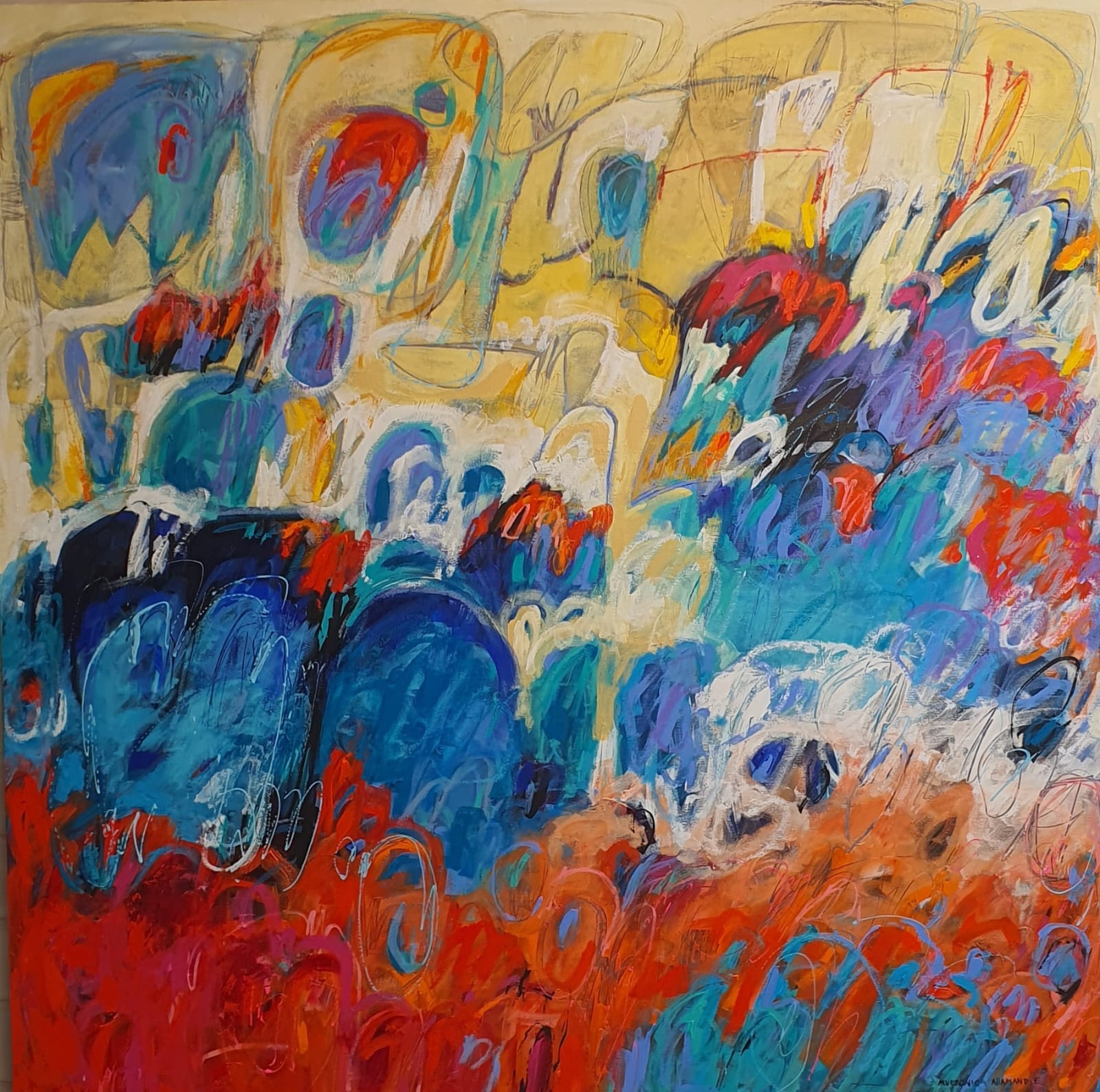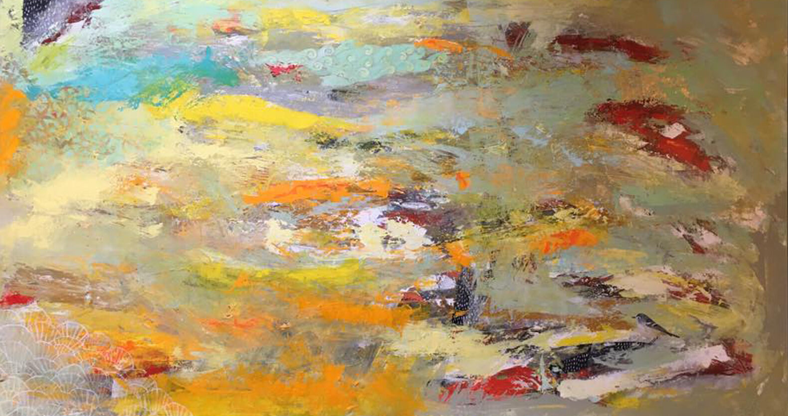 Poco a poco mi abstracto va cobrando sentido, los dorados emergen bajo los tonos turquesas y blancos, recordándome el mar del caribe, donde quisiera estar en este minuto. Cierro los ojos y pienso en esas aguas cristalinas color turquesa que me invitan al descanso y la meditación. Que mejor que mecerse en una hamaca mirando este espectacular color seducirte para entrar a él.