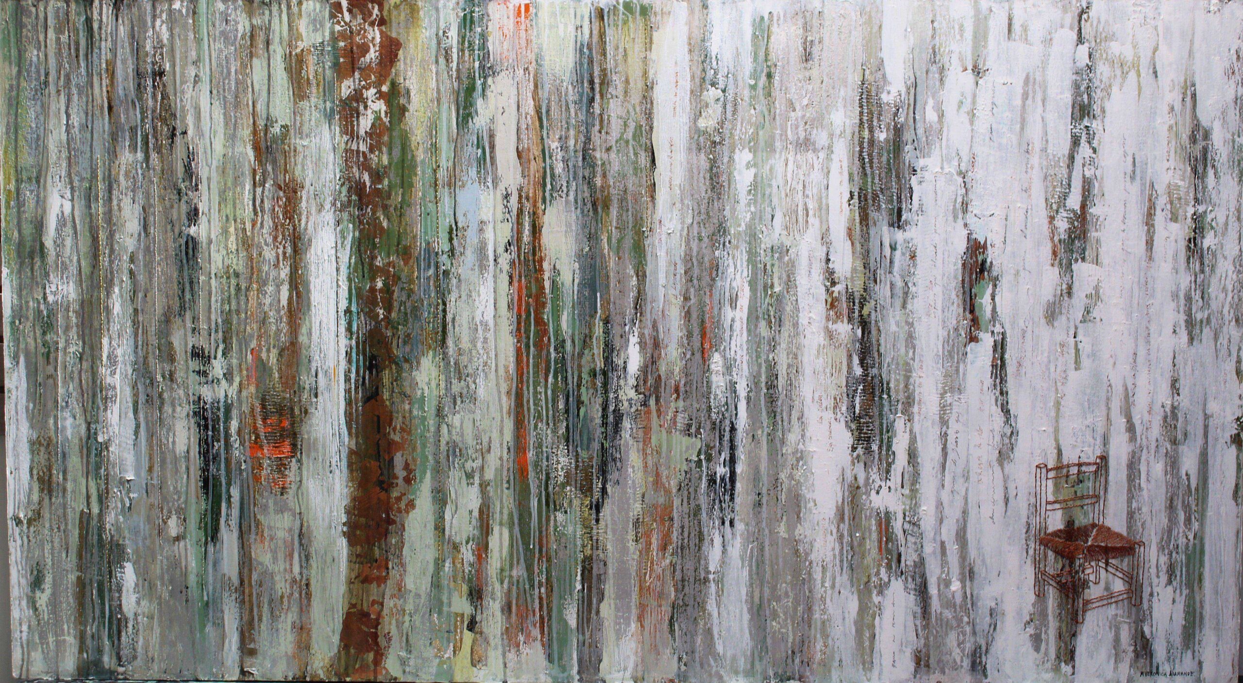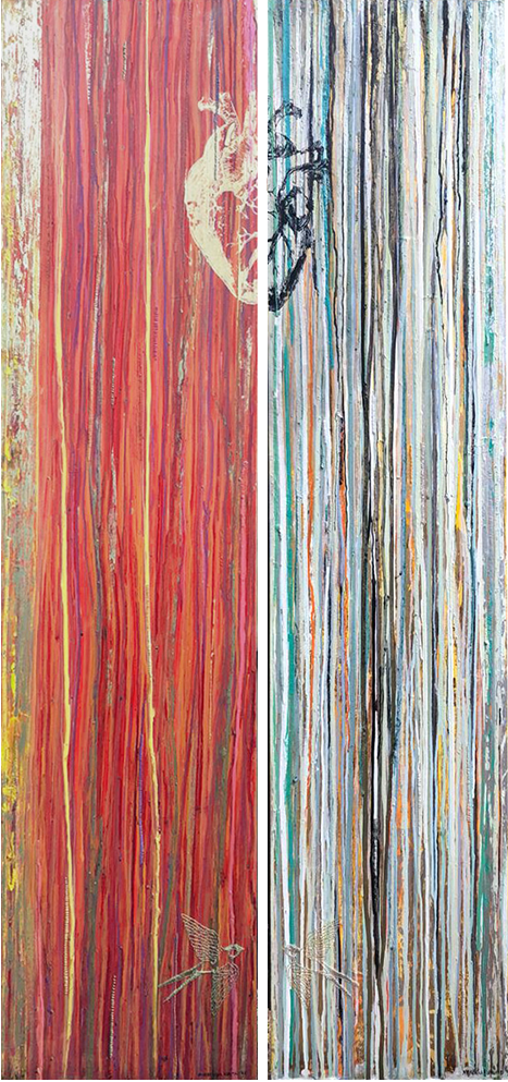 Acrílico, resina, bordado en plata, lámina de cobre, oxido de cobre, oro, seda, algodón, bordado en cobre sobre tela